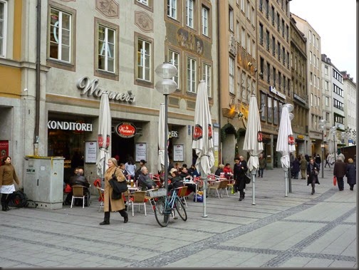 市政廳前和後整個廣場,和旁邊的小巷道,通通被劃成了鋪有古老地磚的行人徒步區,從上圖左的舊市政廳(下面有兩個隧道那一棟)、聖神教堂(舊市政廳後面的綠色尖塔)和噴水池開始,到廣場四周,一直延伸到旁邊的鐵阿提納街(Theatinerstr.)為止。